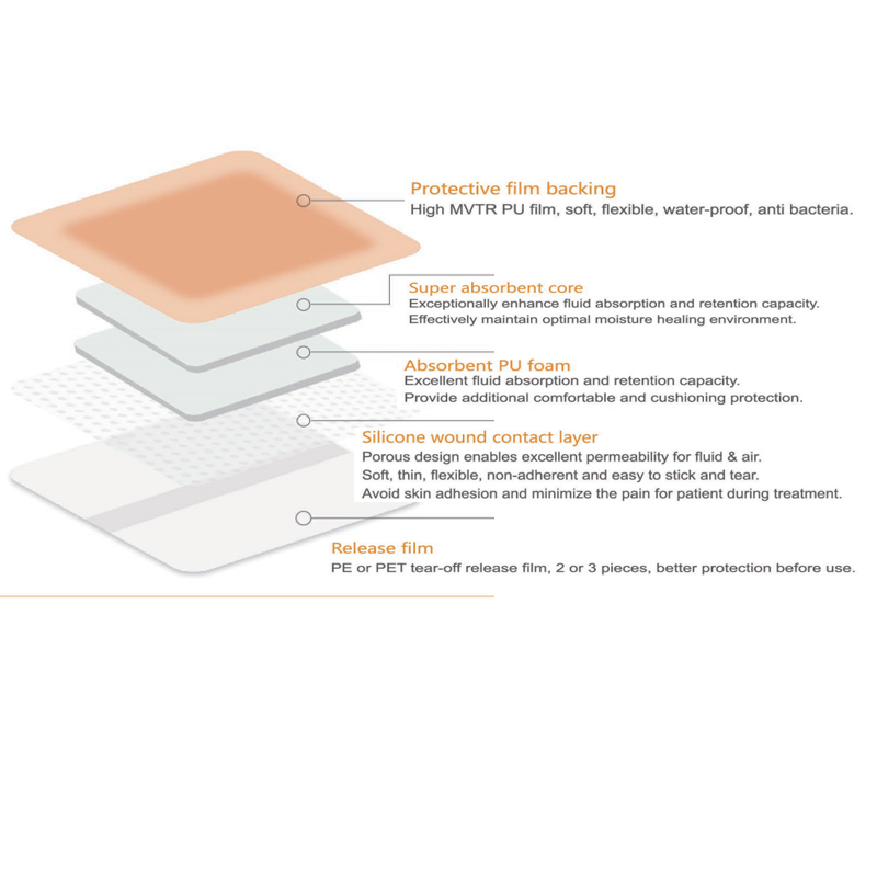 Bordered slicone skumbandage er en selvklæbende bandage med en ekstra kant, der består af beskyttende flm bagside, superabsorberende kerne, absorberende PU skum, siikone sårkontaktlag og release fim.