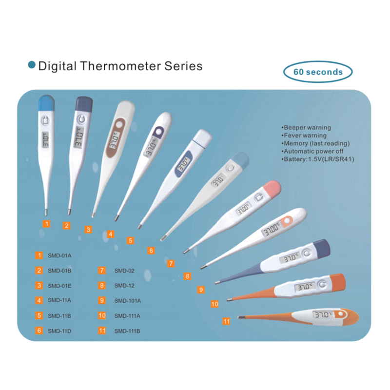 | SMD-01A | 15,5 x 6,5 mm | 127x18x10 mm | 10,5 g | 32,0℃-42,0℃ 89,6F-107,6F | ±0,1 ℃ (35,5 ℃ -42,0 ℃)/ ±0,2F (95,9F-107,6"F) ±0,2 ℃ (< 35,5 ℃) ±0,4F (< 95,9F) | 0,1 ℃/ 0,1F | 60 sekunder | ||