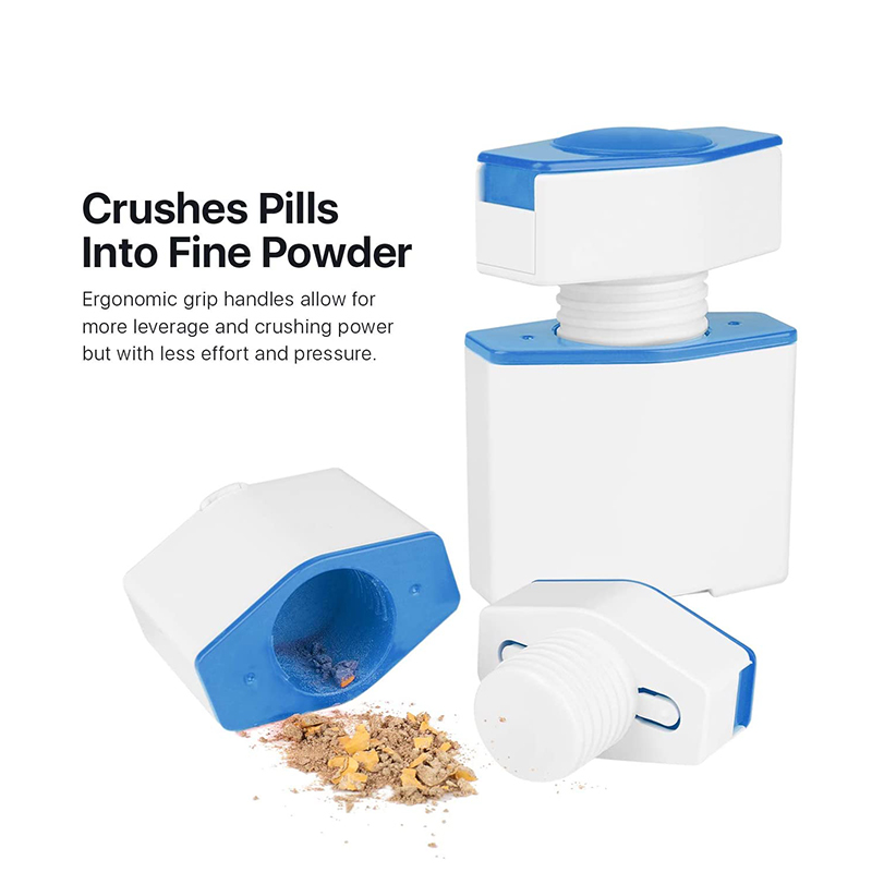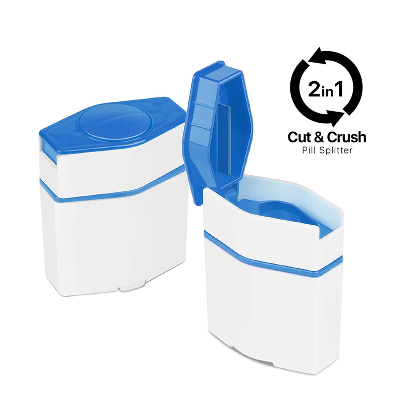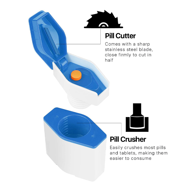 Den knuser piller til fint pulver, bruger en klinge i rustfrit stål til at dele pillerne ordentligt op, og opbevarer dine afskårne og uudskårne kapsler på forhånd.