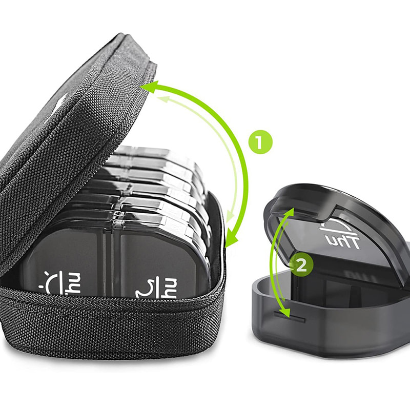 Denne pilleholder passer ind i din pung, kuffert, rygsæk, lomme, træningstaske, hvilket betyder, at du kan tage den med overalt.