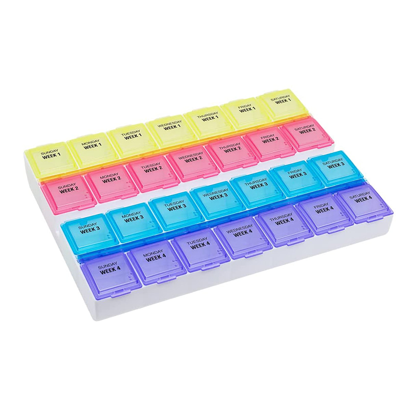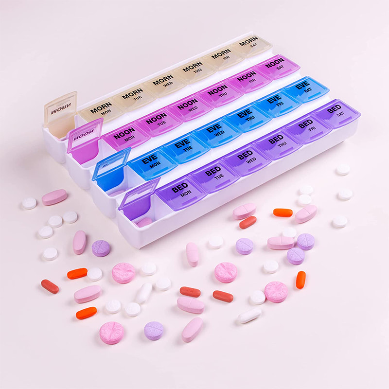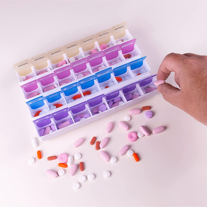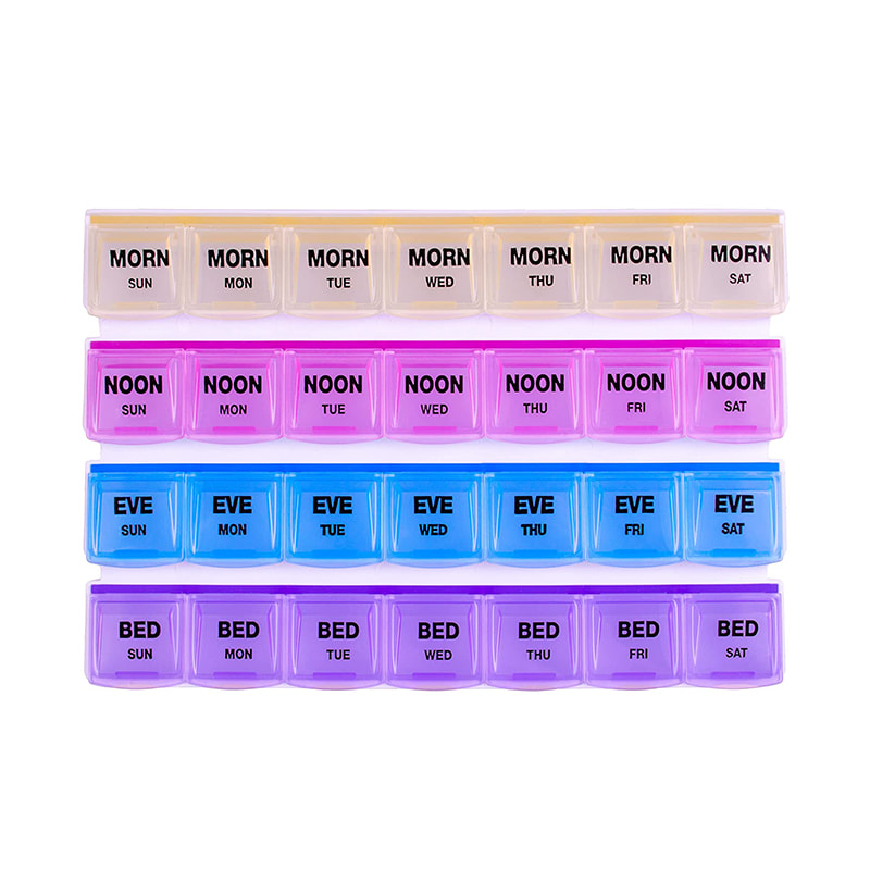 Denne 7-dages pilleæske giver dig mulighed for at organisere medicin til morgen, eftermiddag, aften og sengetid. Farvekodede, gennemsigtige, letåbne låg gør det nemt at dobbelttjekke, at du har organiseret og taget dine piller korrekt