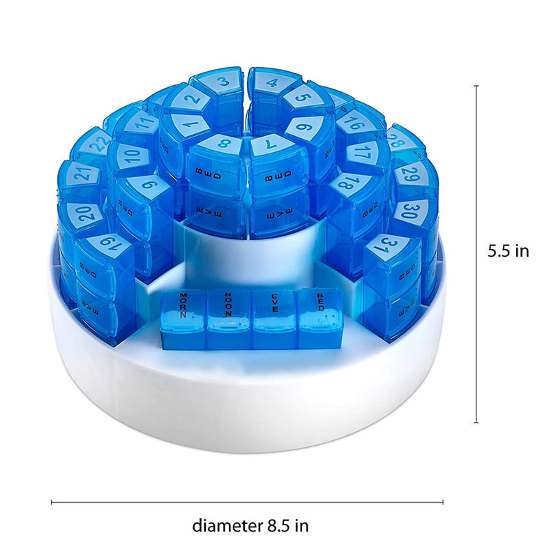 Det cirkulære design giver også mulighed for, at mens-pille-arrangøren nemt kan placeres på en bordplade, samtidig med at du kan tage hver dag medicin med dig, uanset hvor du går!
