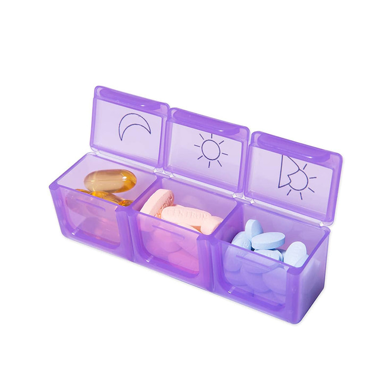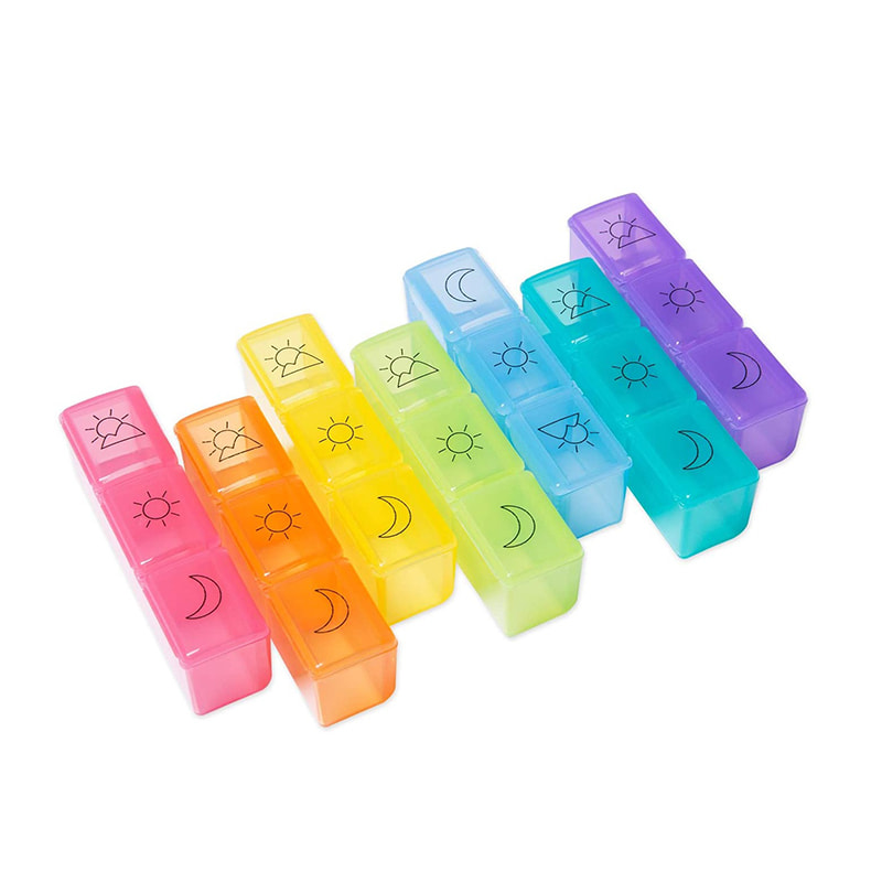 Hvert daglige pilleetui er farvekodet og designet med 3 rum - morgen, middag, aften.
