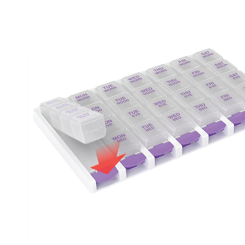 LET BRUGE: Trykknapper og afrundet bund, gør pilleorganisator nem at åbne og medicin nem at hente