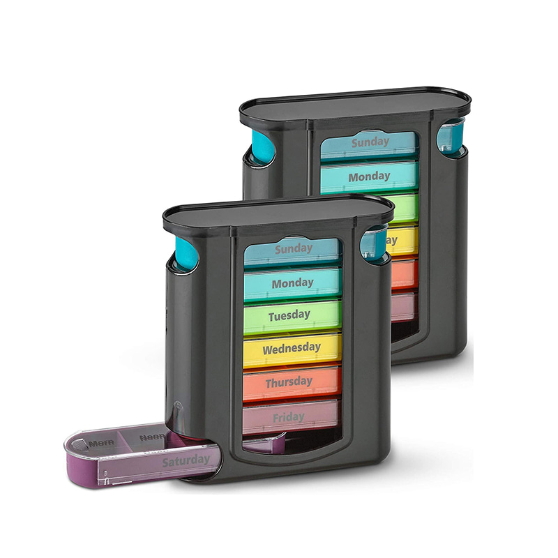 Yderkassen er designet gennemsigtig, og hver bakke har en unik lys farve, så brugeren nemt kan skelne ugedage.