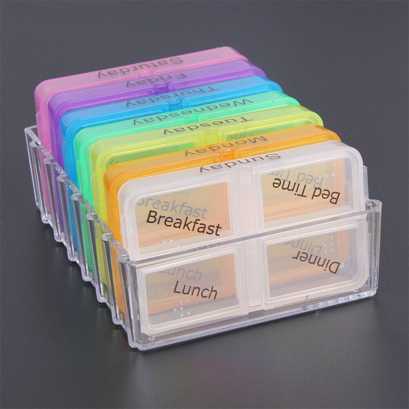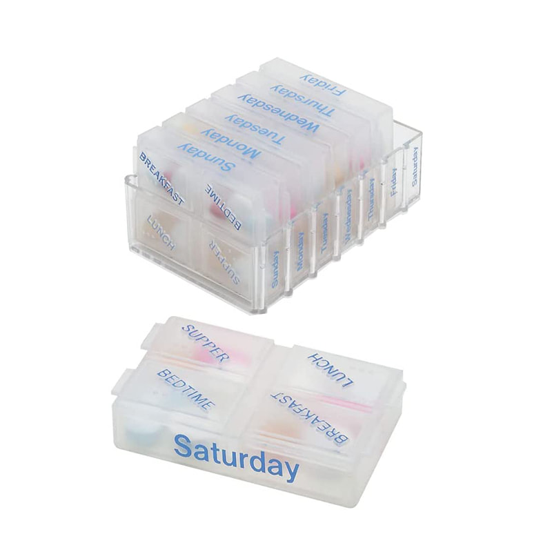 Denne daglige pillebeholder har store, letlæselige etiketter på hvert rum, så du altid kan finde din medicin uden besvær.