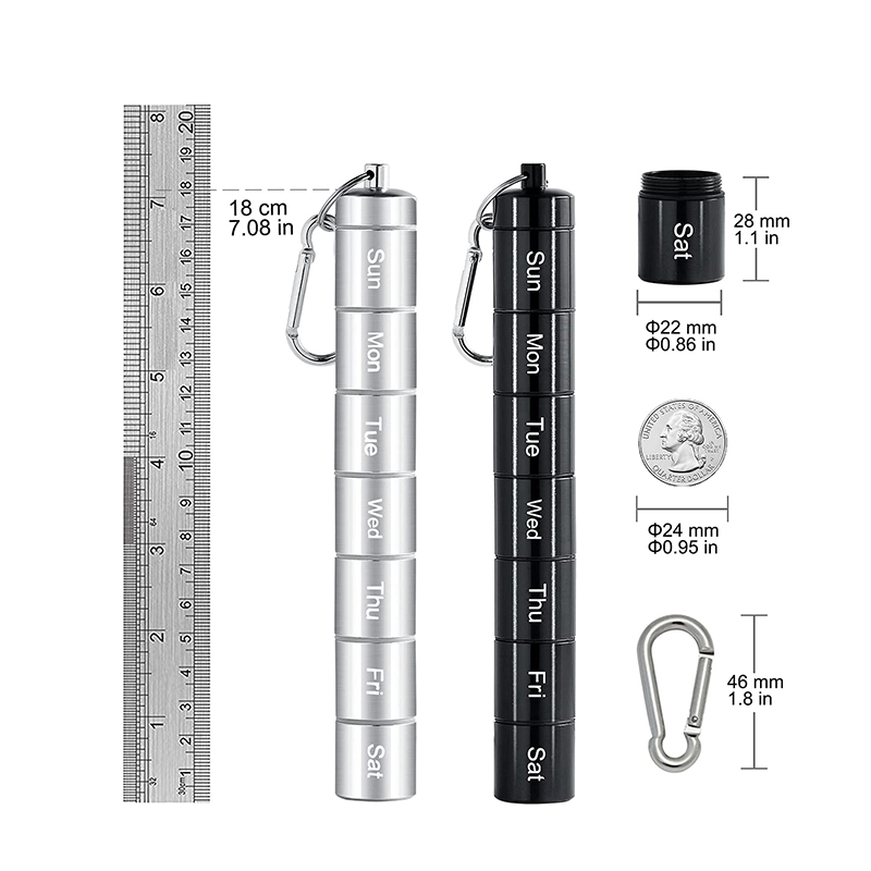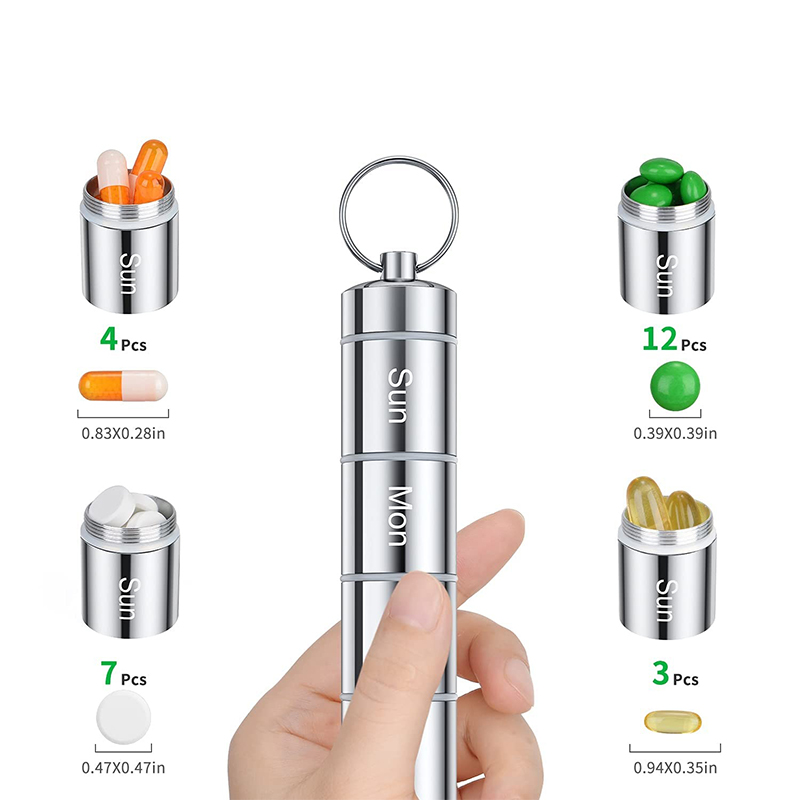 Hvert ugentlige pilleetui har en nøglering og bjergbestigningsspænde, så de kan hænges på nøgleringen eller tasken, let at bære, med silikoneforseglingsringdesign, de er fugtbestandige og vandtætte