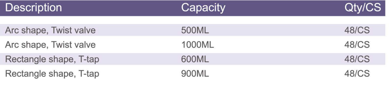 Kapacitet tilgængelig i 350ml, 500ml, 600ml, 750ml, 800ml,