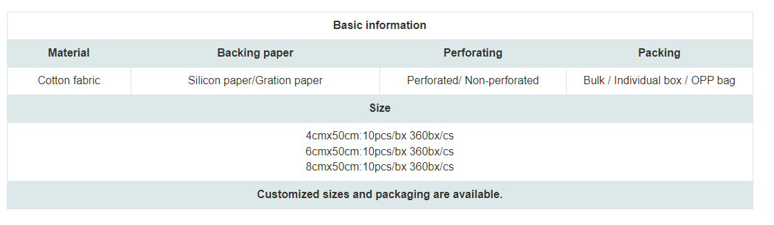 Cotton wound dressing is a kind of sheet or roll wound dressing, made of adhesive coating cotton fabric, absorbent pad and release layer. Den bruges til førstehjælp og midlertidig forbinding af små sår, afskrabninger, skæresår eller andre overfladiske sår.